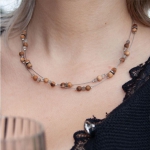 Die Halskette besteht aus zwei Reihen, die kunstvoll mit handgeschliffenen Perlen aus südsteirischem Weinstockholz und facettierten Mondsteinen besetzt sind. Jede Perle und jeder Stein ist einzigartig in seiner Maserung und Farbe, was jedem Stück einen individuellen Charakter verleiht. Die natürliche Schönheit des Holzes und der Steine wird durch die Verwendung von Hämatitperlen ergänzt, die für ihre erdende Wirkung bekannt sind. Bei der Halskette "Pinot" wird ein robuster und nicht färbender Edelstahldraht verwendet, der nicht nur langlebig ist, sondern auch einen Hauch von modernem Charme verleiht. Nicht nur passend für Trachten-Outfits, sondern für viele Stylings perfekt geeignet.
